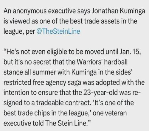 勇士當前最好的交易籌碼,莫過於23歲的庫明加。名記Stein之前更是表示,庫明加被視為聯盟最具交易價值的籌碼之一,明年1月15日起即可被交易,到時勇士或許就有大動作。