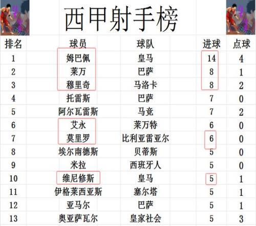 射手榜方麵,姆巴佩今天點射建功後,再拉大領先優勢,比第2的萊萬,穆裏奇多了6球。托雷斯,阿爾瓦雷斯7球並列第4。莫裏羅今天梅開二度,追上艾永,兩人6球並列第6。維尼修斯無力破門,還是和亞馬爾,奧亞薩瓦爾等人5球剛好擠入前十。