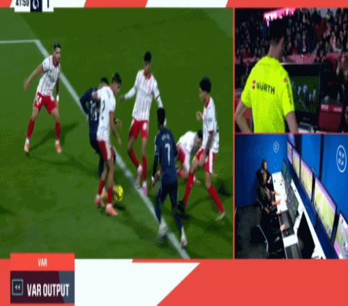 第22分鍾,皇馬還是左路發起進攻,維尼修斯禁區前沿強行突破殺入禁區左腳大力抽射,皮球稍稍高出橫梁。第26分鍾,赫羅納右路範進,齊甘科夫禁區前沿左腳大力兜射,門將庫爾圖瓦撲救脫手,不過他倒是搶在瓦納特補射之前將球撲住。第40分鍾,皇馬前場圍攻造成門前一片混亂,混戰中姆巴佩轉身將球捅入網窩,主裁在VAR確認後,認定姆巴佩手球在先,進球被吹掉。上半時最後1分鍾,赫羅納右路快速反擊,林孔快速推進45度角橫傳中路,齊甘科夫前點策應巧妙將球往中路做,無人防守的奧納希點球點前迎球右腳大力兜射,皮球應聲入網,赫羅納半場結束前1:0打破僵局。