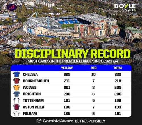 數據統計顯示,切爾西是自23/24賽季以來在英超拿紅黃牌最多的球隊,共計239張。