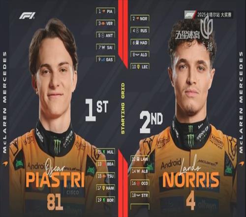 在昨天結束的排位賽中,皮亞斯特裏奪得杆位,諾裏斯在他身旁起步。維斯塔潘第三,和拉塞爾同處第二排發車!本站比賽,輪胎供應商的“強製兩停”也為本場比賽增加變數。