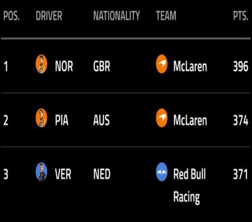 經曆了衝刺賽後,前三名的積分差距發生了變化,諾裏斯積396分排名第一,拿到衝刺賽冠軍的皮亞斯特裏積374分位列第二,排名第三的維斯塔潘積分為371分。