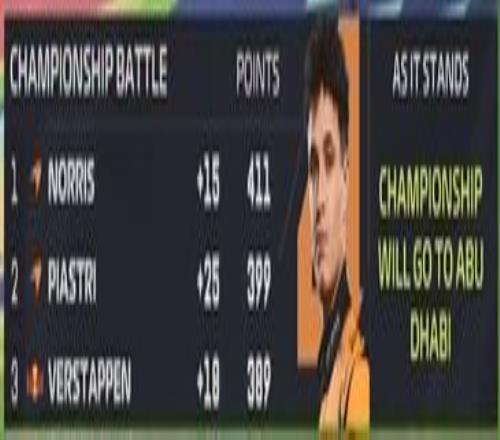 隨後官方給出數據統計,如果比賽以這樣的排位結束,那麽皮亞斯特裏將追近10個積分,維斯塔潘也將追回3分,三人將帶著22分的積分差距進入阿布紮比大獎賽。