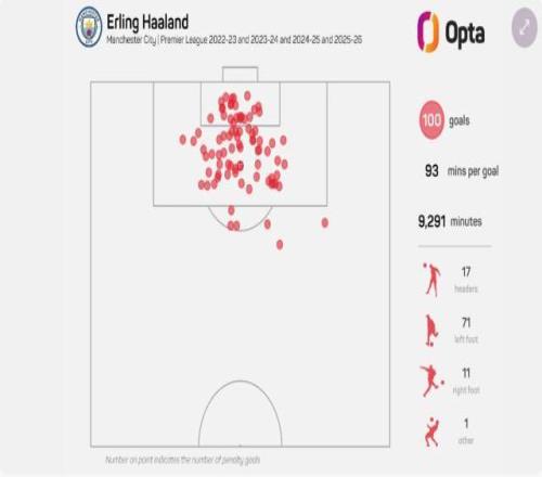 ⑥哈蘭德100球中,左腳打進71球,右腳11球,頭球17個,另在2023年4比4切爾西一役用襠部懟進1球。至於進球地點,94球在禁區內,6球來自禁區外,表明哈蘭德遠射能力不算差。