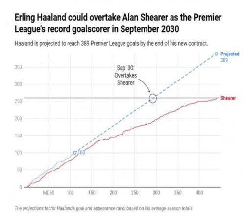 有統計機構測算,照這個速度,再過不到5年時間,哈蘭德就將於2030年9月,在30歲年紀,超越希勒的260球,成為英超曆史射手王。英超官方的測算結果慢一些,要等到2031年3月或4月。