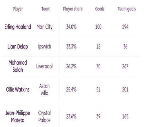 ⑤哈蘭德加盟以來,曼城在英超一共打進294球,哈蘭德貢獻了其中34%,這個占比為同期英超之最,隻有德拉普在伊普斯維奇的貢獻與此接近,薩拉赫在利物浦總進球中的占比“隻有”26.2%。