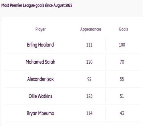 ①2022年登陸英超以來,哈蘭德進了100球,同期離他最近的薩拉赫隻有70球,伊薩克55球就差得更遠。