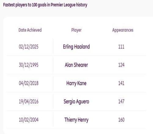 用了111場比賽,25歲的哈蘭德解鎖了英超100球成就。曼城客場5比4險勝富勒姆,哈蘭德首開紀錄的一球意義非凡。英超曆史上沒人比挪威魔童更快達到百球裏程碑,希勒三十年前用了124場,比哈蘭德多13場。