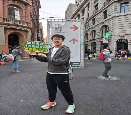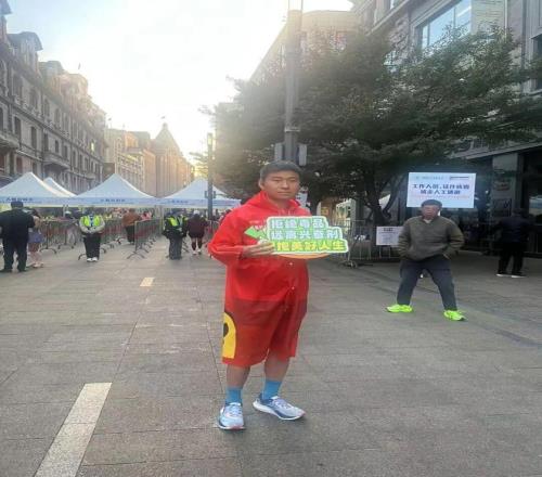 在黃浦區外灘濱江的晨光中,參賽選手手持“拒絕毒品 遠離興奮劑 擁抱美好人生” 的宣傳標語牌,精神抖擻地開啟征程。