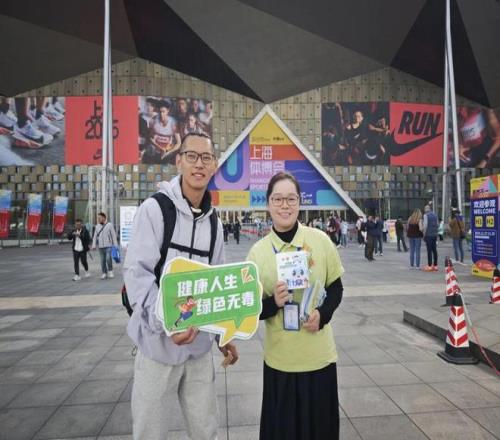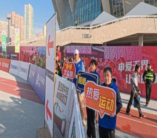 在徐匯濱江的跑道邊,禁毒社工和市民一起為參賽選手加油!