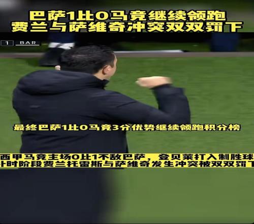 兄弟們,昨晚西甲這場巴薩打馬競的比賽,那叫一個刺激!巴薩靠著登貝萊的製勝球,1-0在馬競主場把三分揣兜裏了,現在繼續在積分榜上領跑。但要說最抓馬的,還得是補時階段費蘭·托雷斯和薩維奇那頓互毆,倆人直接雙雙被罰下,這場麵在西甲也算是相當炸裂了。