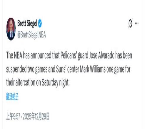 北京時間12月29日,NBA官方公布了昨日衝突的罰單,鵜鶘後衛阿爾瓦拉多禁賽兩場,太陽中鋒馬克-威廉姆斯禁賽一場。兩人禁賽場次將沒有薪水收入。阿爾瓦拉多將在12月30日對尼克斯和1月1日對公牛的比賽中禁賽。馬威將在12月30日對奇才的比賽中禁賽。
