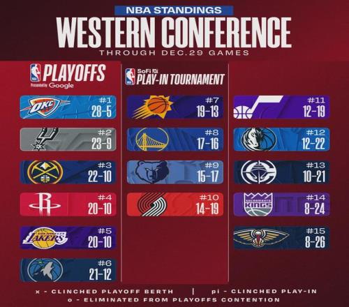 目前掘金22勝10負西部第三,落後第二的馬刺1個勝場,領先第四的火箭1個勝場,領先第七的太陽3個勝場。掘金正在進行東部7連客,還剩5場:猛龍、騎士、籃網、76人、凱爾特人。約基奇至少缺席到1月28日,這期間掘金有16場比賽。