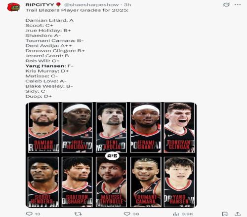 開拓者媒體Ripcityy為開拓者眾將的2025年進行了評分:(楊瀚森是最差的那個)