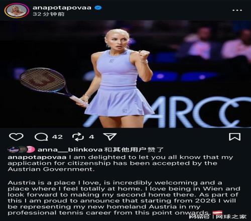幾乎在同一時間,另外兩位俄羅斯選手也完成了“國籍轉換”。世界排名第112位的拉希莫娃決定代表烏茲別克斯坦參賽,她的母親是烏茲別克人;年僅22歲的季莫費耶娃也在今年11月宣布代表烏茲別克斯坦出戰,她的家庭已於六個月前移居該國。今年3月,世界排名曾達第12位的俄羅斯名將卡薩金娜宣布獲得澳大利亞永久居留權;世界排名第51位的俄羅斯網球選手波塔波娃宣布,她的奧地利公民身份申請已獲批準,將從2026年起代表奧地利參賽。她在一份聲明中寫道:“奧地利是我熱愛的國度,這裏的人們無比熱情,讓我感受到賓至如歸的溫暖。”