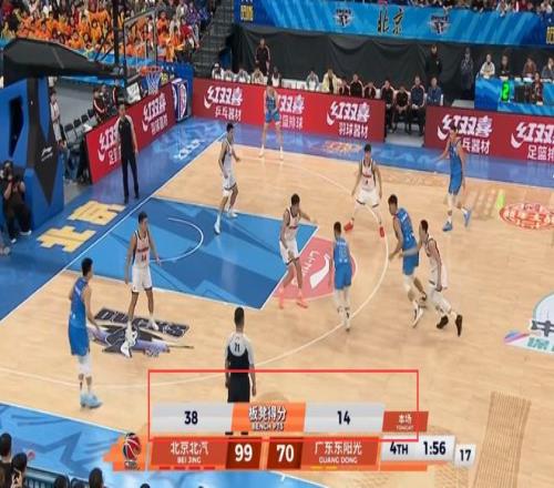 第一個好消息——曾凡博複出後狀態火熱。這一場比賽北京首鋼贏得有點狠了,出乎不少球迷預料,賽前很多球迷預測,北京這場少了陳盈駿,替補陣容沒人帶可能會很難打,趙睿還會像上一輪打廣廈那樣打得很累,但沒想到昨晚北京不僅首發打得好,替補也更是完勝廣東,第四節還剩2分鍾階段,當時北京已經取得99-70領先,此時導播在屏幕下方打出了廣東和北京兩隊板凳得分對比,北京38-14遙遙領先廣東,說明這一場北京首發和替補都同樣出色。