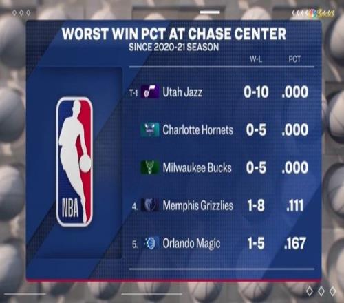 在本場比賽開始之前,轉播方曬出了20-21賽季以來大通中心客隊最差戰績排列,其中,爵士已經在大通中心遭遇到10連敗,5個賽季以來,球隊就沒有在大通中心贏過球。算上本場比賽的失利,爵士已經11連敗。