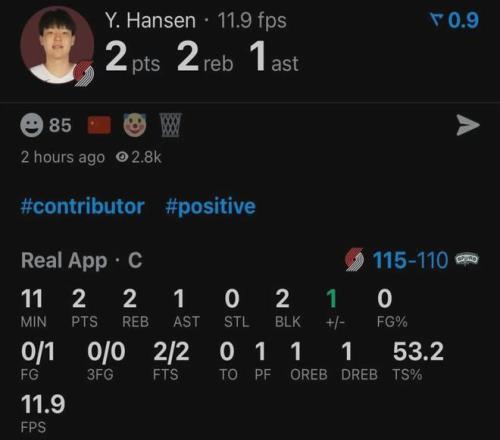 楊瀚森替補出戰約11分鍾,投籃1中0,罰球2中2得到2分2板(1前場板)1助2帽,其中封蓋數全隊第一,幫助開拓者115-110幹翻高居西部第二的馬刺。