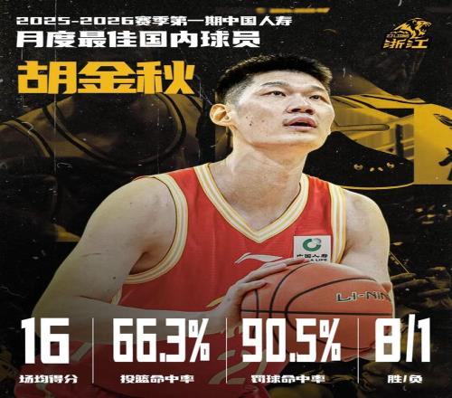 隊長胡金秋在首月出戰9場,幫助球隊取得其中8場勝利,在場均出場25分鍾的時間裏,能夠得到16分、5.1籃板,投籃命中率高達66.3%、罰籃命中率90.5%,且9場比賽胡金秋總共隻出現了4次失誤。