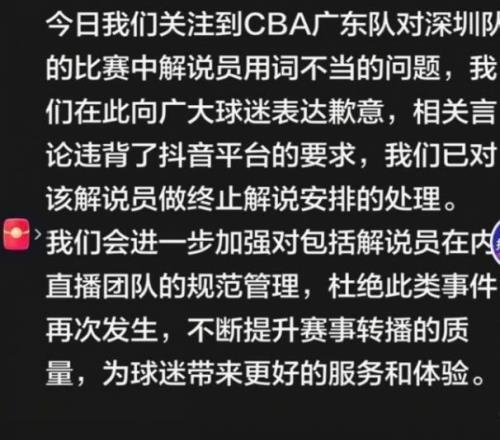 果然也有了效果,賽後某音平台官方道歉,對於該解說員予以終止解說的安排,並要求會進一步加強對包括解說員在內直播團隊的規範管理,杜絕此類事件再次發生,不斷提升賽事轉播的質量,為球迷帶來更好的服務和體驗。