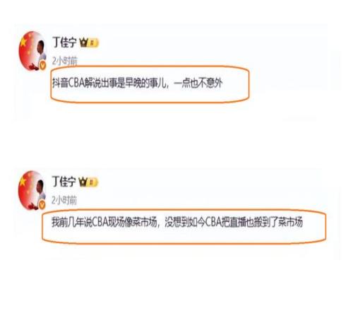 丁佳寧是這樣說道:把CBA直播搬到了菜市場,可以說,抖音CBA解說出事是早晚的事,一點也不會感到意外……