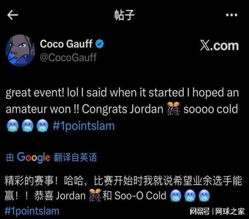 賽後,高芙還在社交媒體上連發兩條一球製勝的博文打趣自己的表現,“既然辛納和蒂亞福都是發球失誤出局,那我感覺好受多了!”在賽事落幕後,她又發文表示,“精彩的賽事!一開始我就說,我希望業餘球員奪冠!恭喜喬丹,太酷了!”
