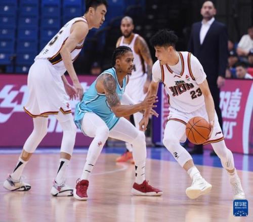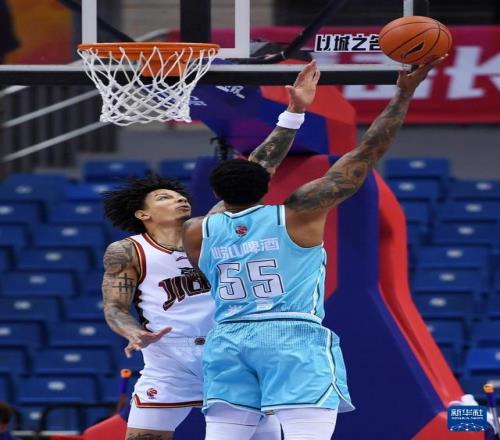 1月15日,青島嶗山啤酒隊球員段昂君(左)在比賽中防守吉林長白山恩都裏隊球員摩爾。新華社記者 李紫恒 攝