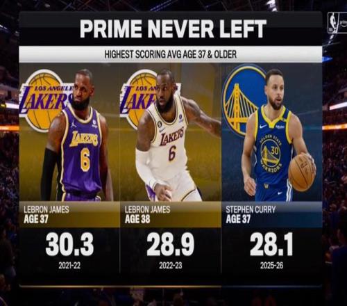 在直播期間,比賽轉播方曬出了兩隊球星詹姆斯和庫裏的場均得分數據進行對比。目前37歲的庫裏本賽季場均得分位28.1分,作為對比,37歲的詹姆斯在2021-22賽季場均能得到30.3分,而老了一歲的他在2022-23賽季還能得到28.9分,高於庫裏本賽季至今的場均得分。