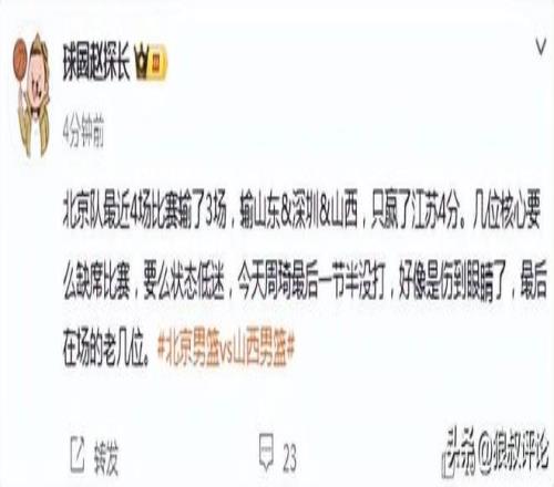 北京隊最近4場比賽輸了3場,輸山東&深圳&山西,隻贏了江蘇4分。幾位核心要麽缺席比賽,要麽狀態低迷,今天周琦最後一節半沒打,好像是傷到眼睛了,最後在場的老幾位。