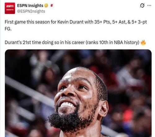 同時本場是杜蘭特加盟火箭之後,首次單場拿到至少35+5助攻+5三分,也是其生涯第21次,位列NBA曆史第十。