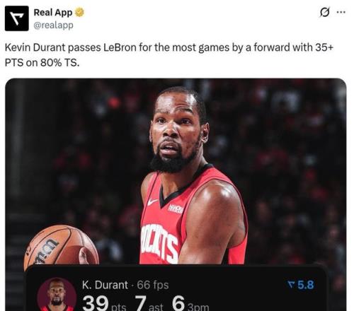 並且這是杜蘭特生涯第21次單場至少轟下35分且真實命中率80%+,成功超越詹姆斯(20次)獨占NBA鋒線曆史第一。