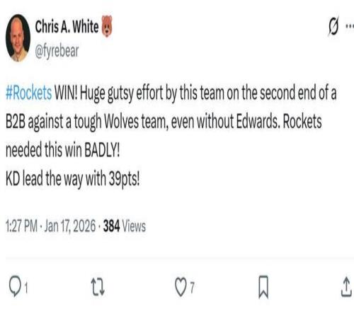 正如賽後火箭媒體人Chris A. White所說:“在背靠背第二戰,火箭隊擊敗了強敵森林狼,全隊展現出巨大的勇氣和拚勁,杜蘭特轟下39分,拿下了一場急需的勝利。”