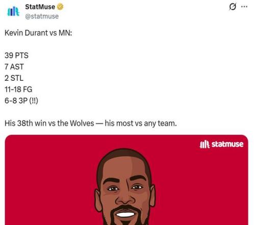 憑借這樣的表現,杜蘭特生涯至今已經38次擊敗森林狼,創造其生涯擊敗球隊次數新高。
