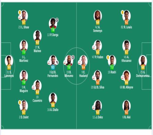 曼城首發:25-多納魯馬、6-阿克、45-胡桑諾夫、68-阿萊恩(46’33-奧賴利)、82-劉易斯、16-羅德裏、20-B席(81’4-賴因德斯)、42-塞梅尼奧、9-哈蘭德(81’63-穆卡薩)、11-多庫(81’21-努裏)、47-福登(46’10-謝爾基)。