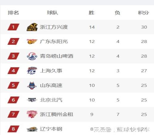 排在積分榜第四名則屬於上海隊,他們的戰績則是12勝3負,由於少賽一輪的緣故,上海隊在排名上稍微吃虧。隻能暫時屈居廣東隊和青島隊之後,排在積分榜第四名。排在積分榜第5名則是山東隊,這一輪比賽他們爆冷輸給了江蘇隊,遭遇到本賽季最慘一敗。目前,球隊的戰績是10勝5負,力壓北京隊排在積分榜第5。而北京隊則緊隨其後,排在積分榜第6名。積分榜第7名則是浙江隊,他們的戰績為9勝7負。