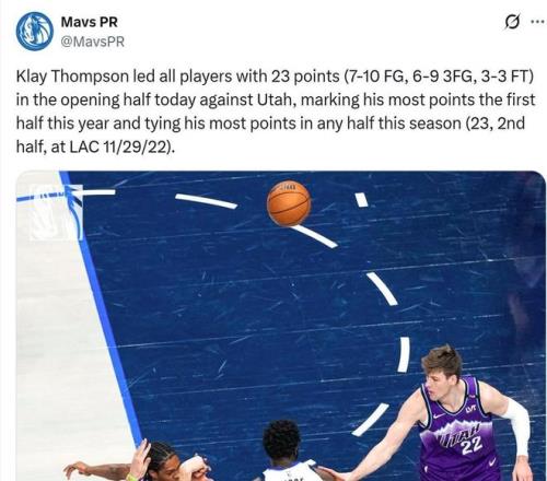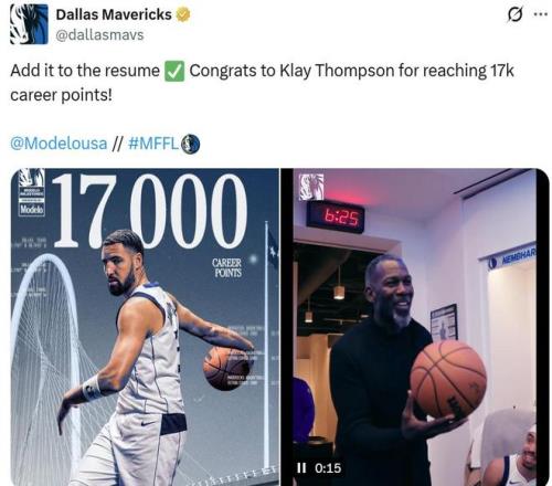 獨行俠官方也專門曬圖慶祝克萊連續兩場比賽迎來裏程碑,在本場總得分突破17000分大關之前,克萊在前一場對陣爵士隊的比賽中,生涯三分命中率才超越利拉德升至NBA曆史第四。