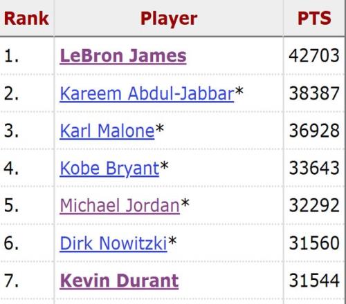 加盟火箭隊的首個賽季,杜蘭特已在得分方麵超越了另一位傳奇球星。本月早些時候,在客場不敵開拓者隊的比賽中,他的生涯總得分完成對張伯倫的超越,躋身曆史得分榜第七。杜蘭特和目前排在第五的邁克爾-喬丹(32292分)之間還差700多分,按目前的得分勢頭,很有機會在本賽季超越喬丹。