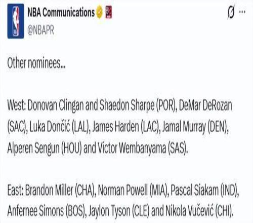 西部:克林根和夏普(開拓者)、德羅讚(國王)、東契奇(湖人)、哈登(快船)、穆雷(掘金)、申京(火箭)、文班亞馬(馬刺)