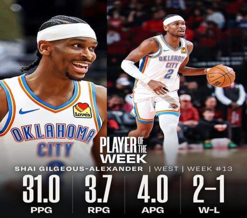 過去一周,亞曆山大率領雷霆打出2勝1負的戰績,場均31分3.7籃板4助攻2蓋帽,投籃命中率54.7%。