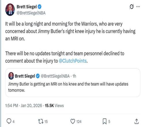 名記Brett Siegel賽後曝出,勇士非常擔心巴特勒的狀況,後者正在接受核磁共振檢查,今天不會更新任何傷情狀況,勇士隊內也拒絕對傷情發表任何評論。