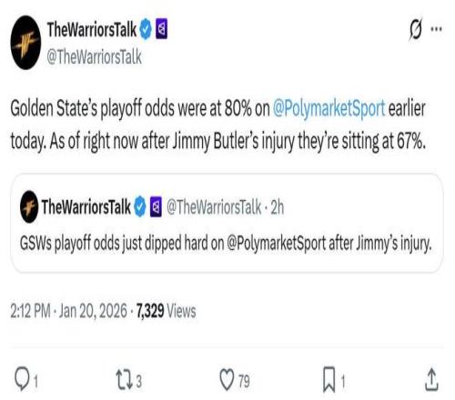 體育預測市場平台Polymarket Sports也在第一時間更新勇士進入季後賽的概率,在巴特勒受傷後這一數據從80%暴跌至67%,迅速下滑13個百分點。