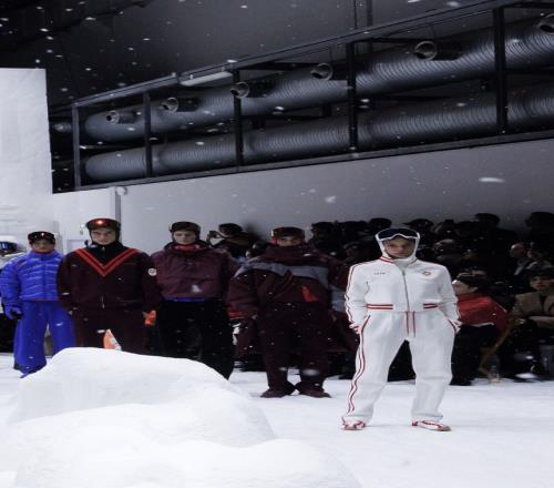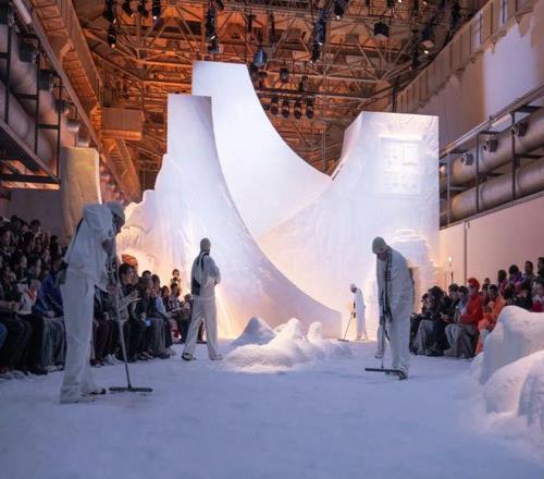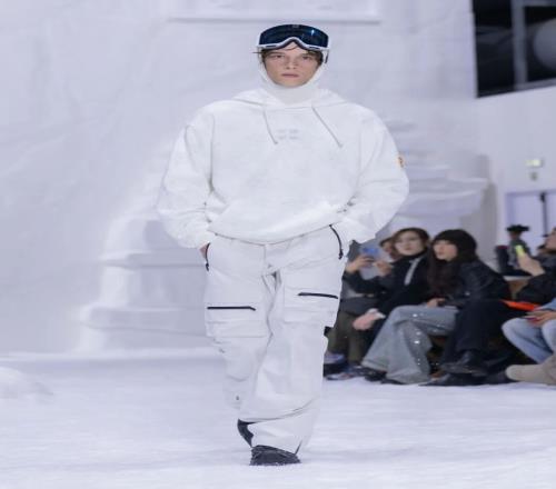 懷舊色調漸漸過渡至純白雪景,來到主秀場,視野被遼闊的雪場景觀無限放大,冬季運動競技場躍現眼前。取自專業滑雪賽道與運動員舒展姿態的動態軌跡與空間張力,令秀場氛圍更加真實而沉浸。