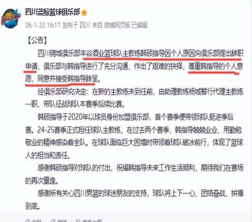 四川藍鯨籃球俱樂部官宣,主教練韓碩指導因個人原因向俱樂部提出辭職申請,俱樂部與韓指導進行了充分溝通,作出了艱難的抉擇,尊重韓指導的個人意願,同意並接受韓指導辭呈。韓碩也將成為CBA第六個下課的主教練。韓碩辭職後,將由助理教練楊城暫時代理主教練職務。