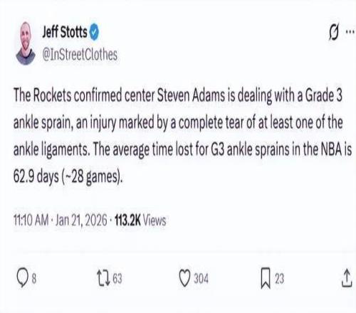 此前對陣鵜鶘的比賽中,亞當斯在籃下踉蹌倒下,賽後傷病報告顯示,腳踝三級扭傷,至少休息三到六個月。
