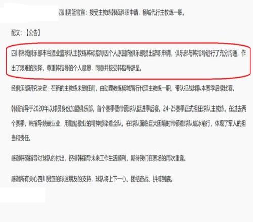 值得一提的是,在剛剛,CBA本賽季第六個下課的主教練也是產生了,他就是四川隊主教練韓碩,根據四川隊公布的內容,此番韓碩下課,是他本人主動申請辭職,隨後,四川隊也是與韓碩進行了充分地溝通,最終,做出了一個無奈的選擇,尊重韓指導的個人意願,同意了他的辭職。