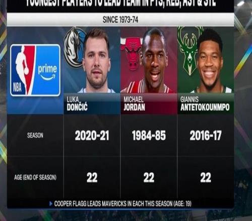 需要關注的是,曆史上最年輕的得分、籃板、助攻、搶斷均領銜全隊的球員,分別有20-21賽季,22歲的東契奇;84-85賽季,22歲的邁克爾喬丹,16-17賽季,22歲的字母哥。本賽季弗拉格得分籃板助攻搶斷也領銜全隊,而弗拉格僅僅隻有19歲。