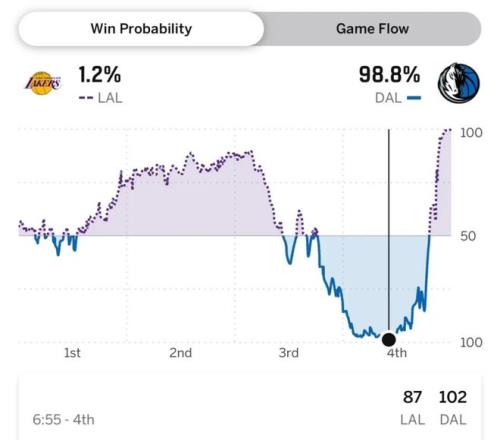 從本場的獲勝概率走勢圖上你也能看出來劇情有多麽炸裂,湖人前兩節半都是更可能獲勝的一方,結果第三節過半情況急轉直下,落後最多時,湖人的獲勝概率僅為1.2%,但他們依然完成了這1.2%的奇跡。