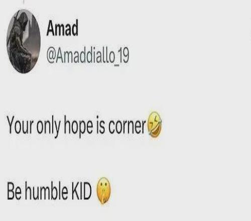 曼聯邊鋒阿瑪德·迪亞洛在周日幫助曼聯3-2客場逆轉英超“領頭羊”阿森納後,第一時間在社媒開嘲:“你們唯一的指望就是角球罷了”,並配上一個笑哭的表情。27歲的科特迪瓦人本場首發出任右邊鋒,踢了88分鍾,是邁克爾·卡裏克兩連勝計劃裏的關鍵棋子。