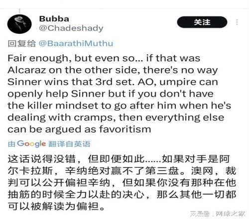 斯皮澤裏的支持者們憤怒地指出,暫停恰好出現在辛納最脆弱的時刻,這“過於巧合”地拯救了意大利人。社交媒體上,“規則幹擾勢頭”的討論迅速升溫。有網友尖銳指出:“如果這是足球比賽,對手受傷倒地後重新開球,受傷方球員會立刻將球踢出界外以示體育精神,但網球規則沒有這樣的傳統。”