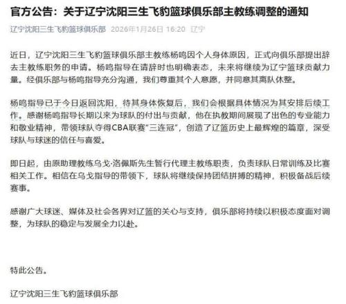 1月26日下午,遼寧沈陽三生飛豹籃球俱樂部發布公告稱,主教練楊鳴正式向俱樂部提出辭去主教練職務的申請,俱樂部尊重其個人意願並同意其離隊休整。後續球隊將由原助理教練烏戈·洛佩斯先生暫行代理主教練職責。